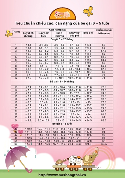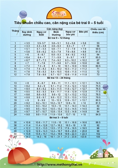 Để giúp các mẹ tiện theo dõi sự tăng cân của bé cũng như không phải thấp thỏm lo lắng vì con thiếu hay thừa cân, đội ngũ bác sĩ của Methongthai.vn đã tổng hợp tài liệu về sự phát triển chiều cao, cân nặng của các bé trong độ tuổi 0 – 5. Tài liệu gồm 6 chỉ số, tương ứng với mỗi tháng tuổi khác nhau: